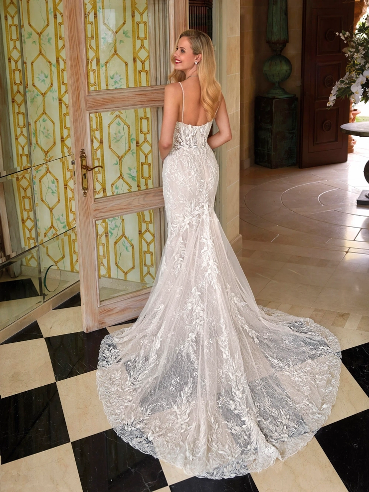 Make a dramatic entrance in style 1239. This figure flattering beauty is embellished with layers of lace and magnificent beading. The stappy, plunging V-neck bodice features seductive sheer touches and a lace embellished detachable train adds a wow factor. Gown additions include detachable train and matching veil V269 (both sold separately)
