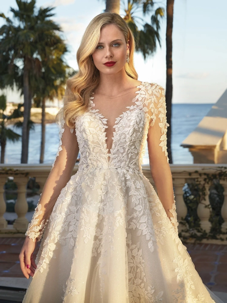 Classic opulence meets modern glamour in style 1247. This dreamy Ball gown is richly adorned with beaded lace over sparkling tulle and features a plunging V-neck bodice with long sheer sleeves and magnificent embellished illusion back with button closure.