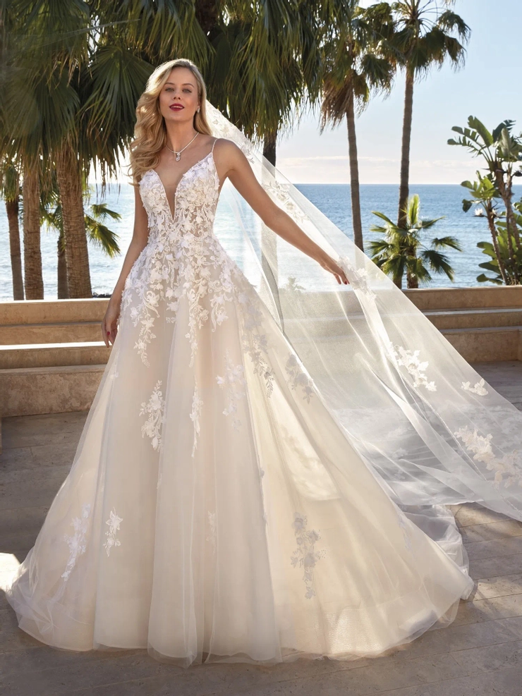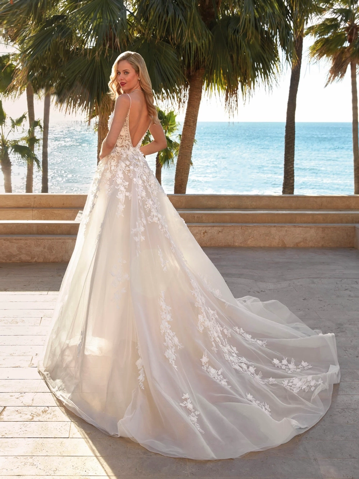 Beautiful style 1221 strikes a perfect balance of ethereal romance and sultry sophistication. Decadent, beaded 3D floral appliques gracefully flow from the seductive V-neck bodice into the lush A-line skirt. Delicate straps highlight the sexy low back. Matching veil V258 (sold separately).