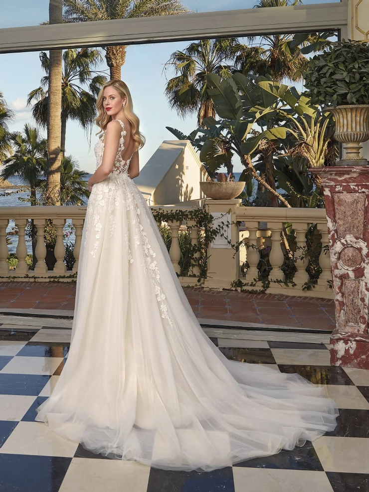 You will be swept away by the ethereal feel of style 1228. Intricate beaded lace and 3D flowers embellish the plunging V-neck bodice and luxurious tulle skirt. Floral, sheer straps give way to a seductive low back with sheer touches. Add a majestic touch with an optional, luxurious detachable train. Matching detachable train (sold separately).
