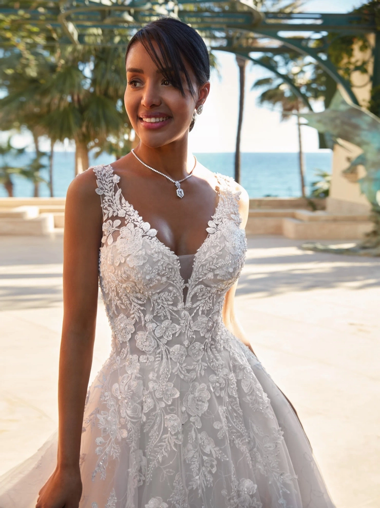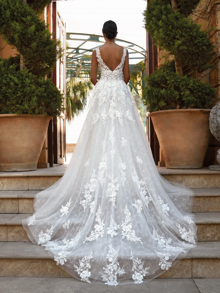 Your happily ever after starts with this ethereal beauty. Style 1232 features a sexy plunging neckline framed with sheer embellished straps and layers of luxurious lace and magnificent floral beaded appliques over shimmering sparkle tulle. Matching veil V259 (sold separately).