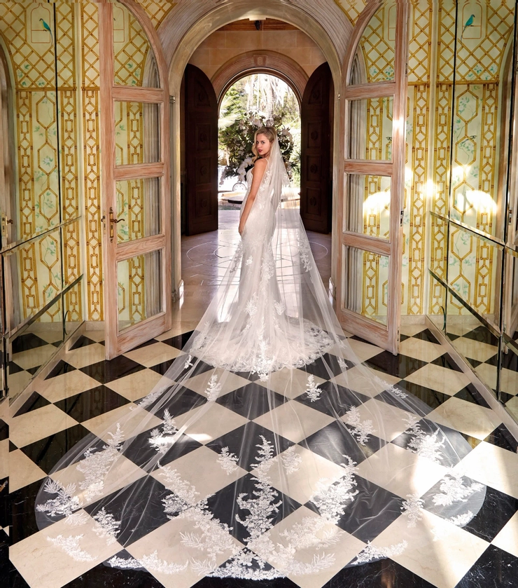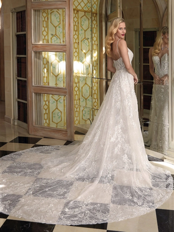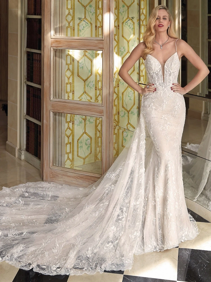 Make a dramatic entrance in style 1239. This figure flattering beauty is embellished with layers of lace and magnificent beading. The stappy, plunging V-neck bodice features seductive sheer touches and a lace embellished detachable train adds a wow factor. Gown additions include detachable train and matching veil V269 (both sold separately)