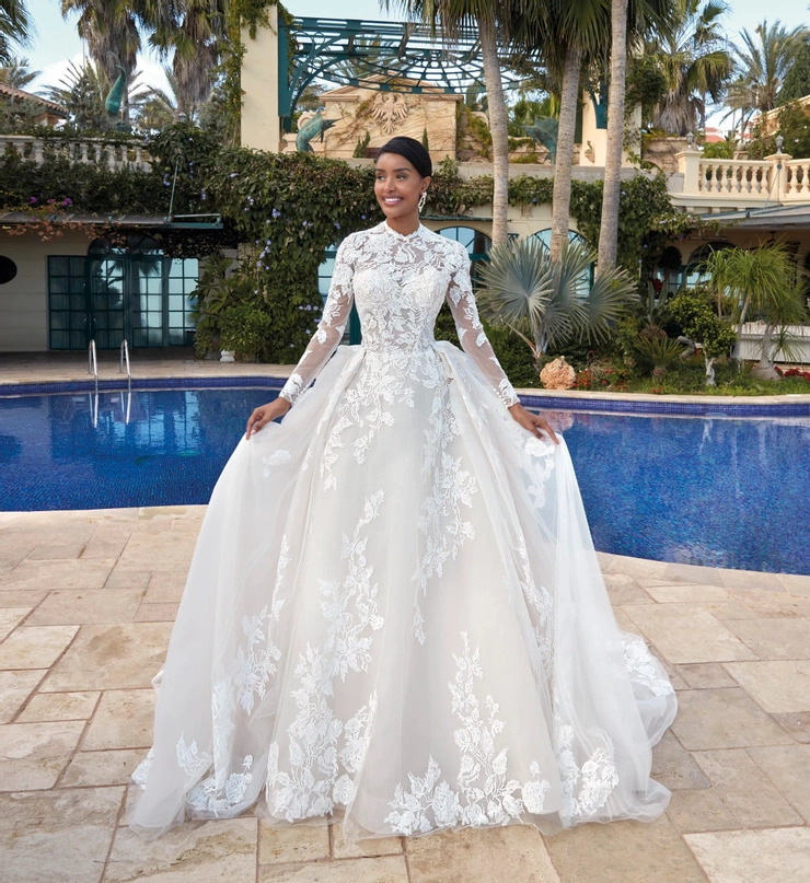 Timeless beauty radiates in style 1241. Ornate, embroidered lace adorns her luxurious skirt and glamorous, high-neck, bodice with long sleeves and transparent detailing. An embellished detachable train adds a regal finishing touch. Matching detachable train (sold separately).