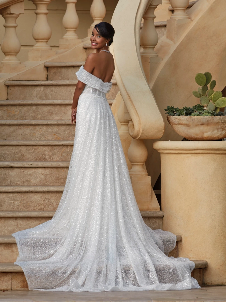 Beautiful style 1252 ties together modern, opulent luxury and dazzling, old world glamour with her shimmering sultry silhouette and seductive, asymmetrical, off-the-shoulder portrait neckline. A lavish detachable train adds the ultimate finishing touch. Matching detachable train (sold separately)