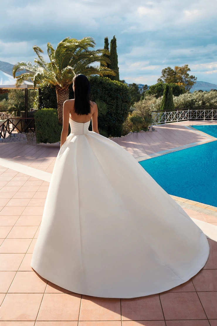 Style 200144 is the embodiment of effortless, understated beauty. Delicate asymmetrical pleats adorn the soft sweetheart, strapless bodice and luxurious A-line skirt. A dramatic slit adds a seductive touch. Available in Satin or Mikado