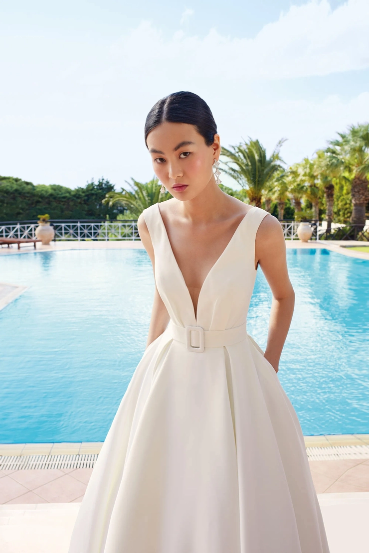 Style 200149 embodies a beautiful balance between classic romance and modern luxury. A simple belt highlights the waistline of the voluminous A-line skirt and a sexy, plunging neckline and low back add a perfect touch of sexy. Available in Satin or Mikado.
